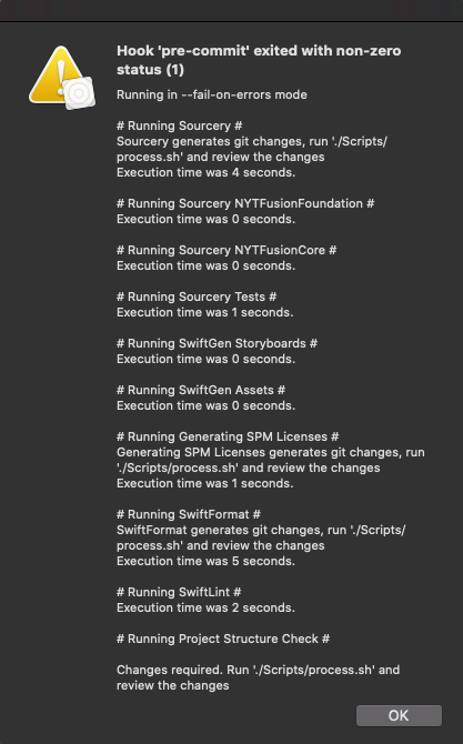 If we try commiting and forget to run the tool we’ll get an error like (here using GitUp IDE):